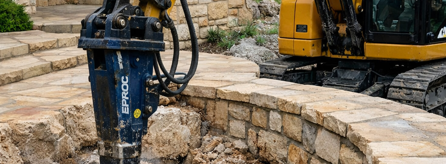 Premium builds in Lakeway and Westlake mean working within feet of existing foundations and retaining walls. Our NPK hydraulic hammer with chisel bit breaks rock without the concussive impact that cracks neighboring structures. Precision, not percussion.
