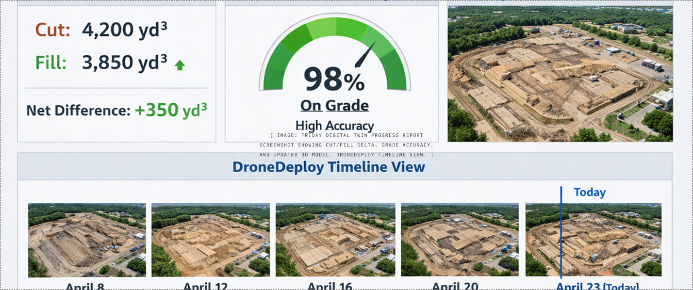 Most contractors discover problems too late. We don't. Every Friday, our team flies the site, updates the digital twin, and sends you a verified progress report — cut/fill delta, grade confirmation, and a timestamp you can share with your client, your engineer, or your lender. No surprises. No disputes. Just data, every week, on schedule.
