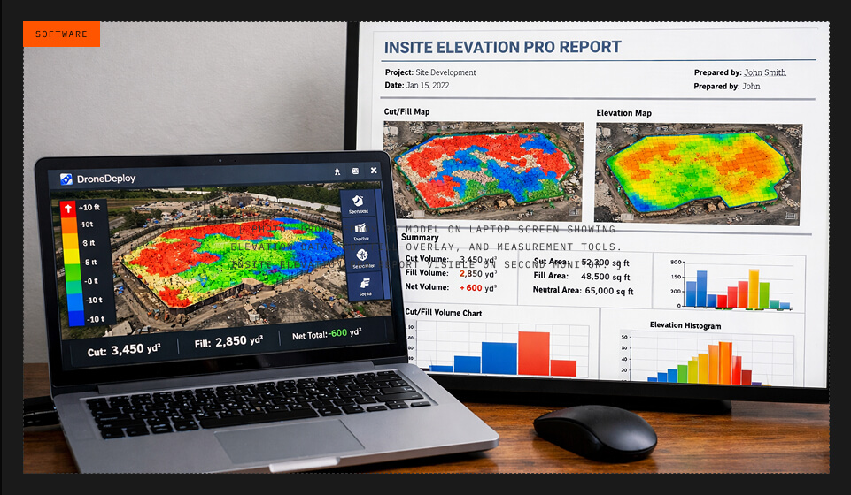Quantified cut/fill reports generated via InSite Elevation Pro, verified against initial RTK site scans. The system of record for billing.